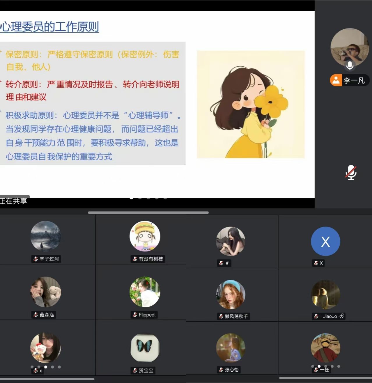 培训会上,李一凡围绕心理服务队伍的重要性、心理服务队伍的角色定位、心理服务队伍的工作内容等方面展开讲解。随后与参训同学深入交流,提醒同学们严守保密原则,秉持实事求是、保持中立的工作原则,以尊重、关心的态度帮助同学,共同营造积极健康的班级心理氛围。