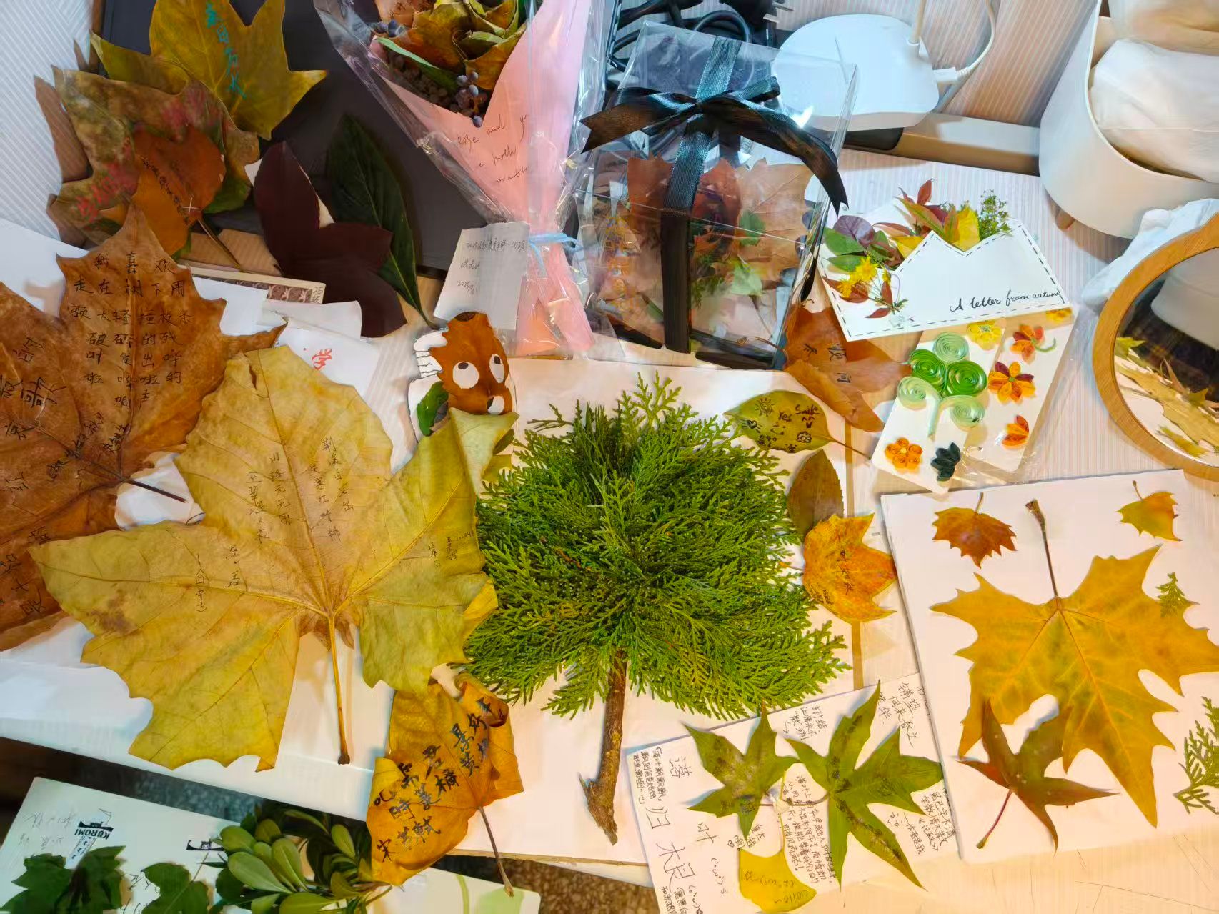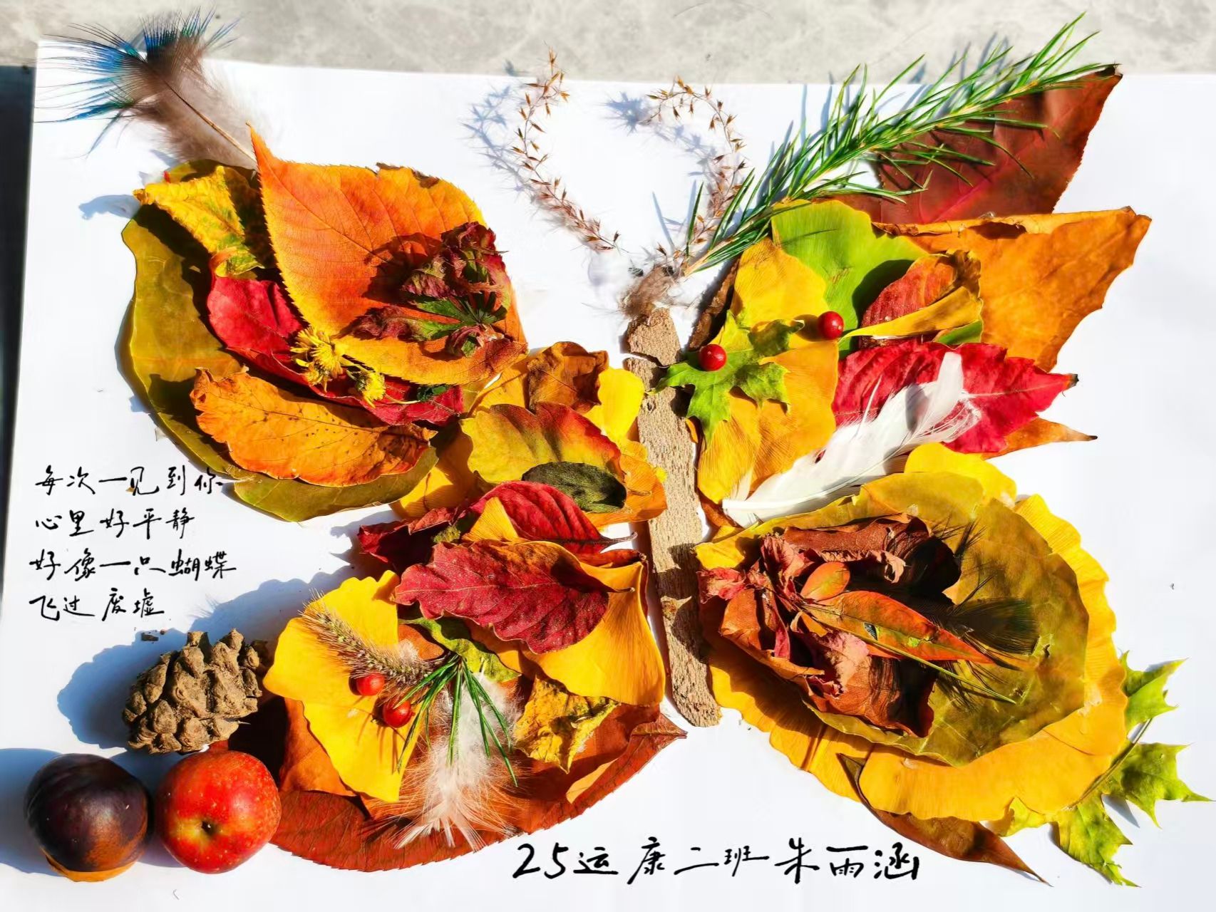 在“落叶诉心声——把秋天写成诗”活动中,同学们漫步校园,捡拾形态各异的落叶,在叶片上写下对家人与朋友的真挚告白,拼贴落叶创作出各具特色的图案,从而发现生活中处处蕴藏着的美感与惊喜。
